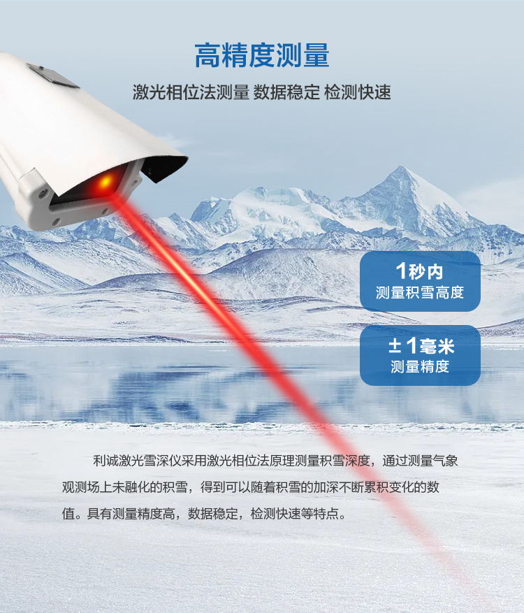激光雪深儀采用激光相位法原理測(cè)量積雪深度,通過(guò)測(cè)量氣象觀測(cè)場(chǎng)上未融化的積雪,得到可以隨著積雪的加深不斷累積變化的數(shù)值。具有測(cè)量精度高,數(shù)據(jù)穩(wěn)定,檢測(cè)快速等特點(diǎn)。