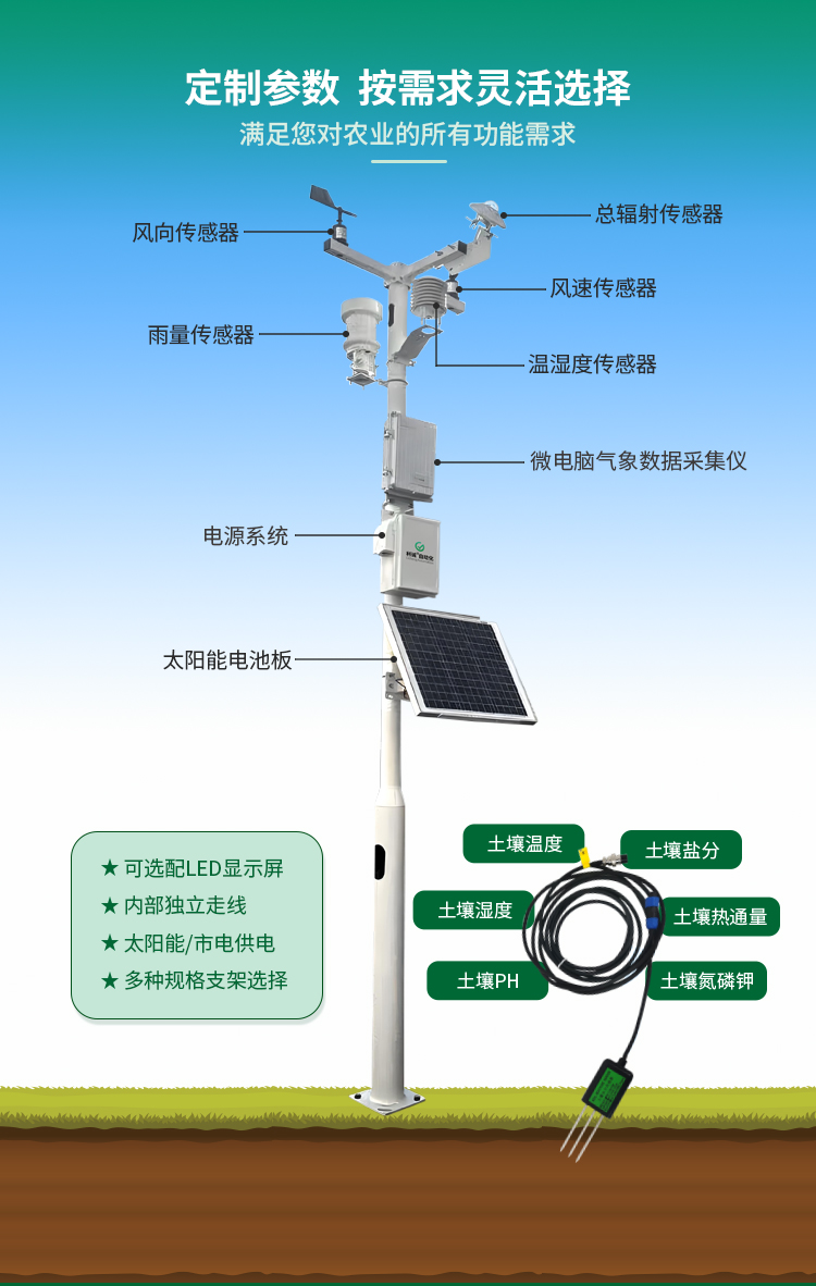 智慧農業監測氣象站作為現代農業管理的得力助手,集成了高精度傳感器和先進的數據分析系統,能夠實時監測和記錄溫度、濕度、風速、風向、降雨量等關鍵氣象數據。這款產品不僅為農業生產提供了科學的決策依據,有效預防氣象災害對農作物的威脅,還能幫助農民優化種植方案,提高產量和品質。無論是大型農場、農業合作社,還是個體農戶,農業氣象站都能發揮其獨特的價值,助力農業生產的現代化、智能化和精準化。
