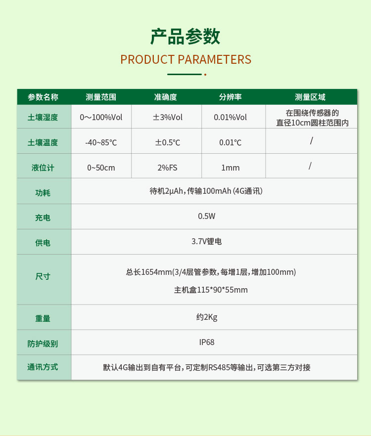 土壤墑情水位一體監測儀,專為現代農田、果園、溫室大棚及科研實驗量身打造,精準灌溉,降本增收,守護每一顆果實。進口傳感器,地下部分準確測量土壤中的水分含量和溫度,地上部分測量液位高度,確保數據的可靠性。2uA低功耗超長續航,鋰電池加太陽能充電系統,滿配電池在陰雨天,可工作200天以上。IP68防水級材質,抗離子干擾,適應復雜土壤環境。4G傳輸,支持PC端與手機APP雙平臺查看,及時干預,科學種植。